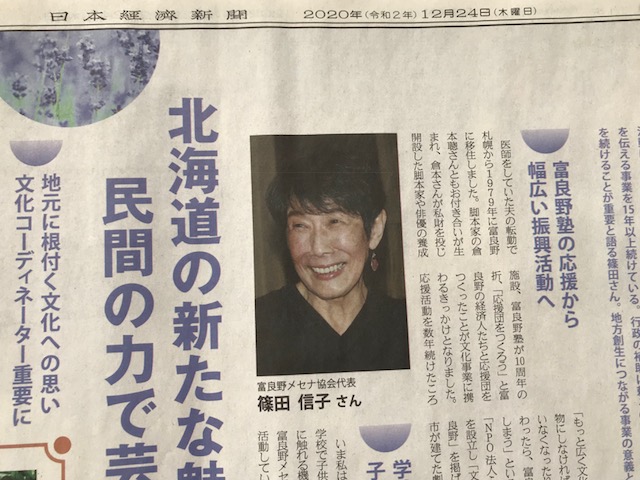 2020-12-24 こんなに大きく掲載されました! 今日、日経新聞にこんなに大きく掲載されました.。 全体の記事は紙面半分で、それも広告欄はクラシックビール、もうドンピシャ(笑)。 文化事業に携わって来た経緯を聞きたいと、わざわざ東京から日経のライターの方と担当部長さんが富良野にお越しになりました。 一番先にメセナ事業への協賛をいただいたフラノデリスの藤田さんと同じ紙面で恐縮しつつ感謝しています。 20数年文化事業に携わって来たことを取材していただき、応援していただいている企業や個人の方々には深く感謝しています。